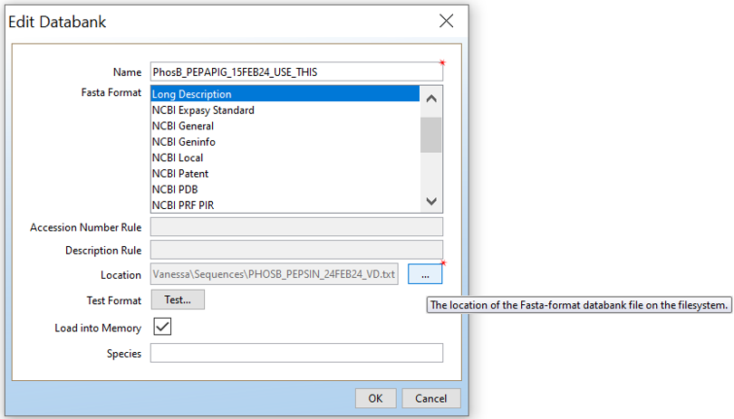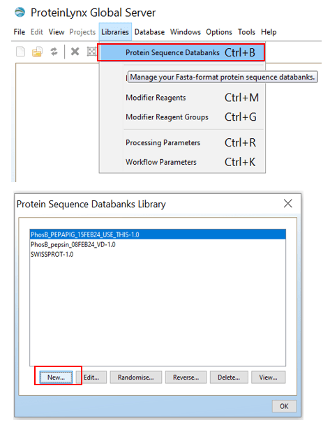 Open PLGS, Libraries, Protein Sequence Databanks and then click on “New..”. Give your protein sequence databank a name, choose “Long Description”, and then the location of the FASTA file you want.