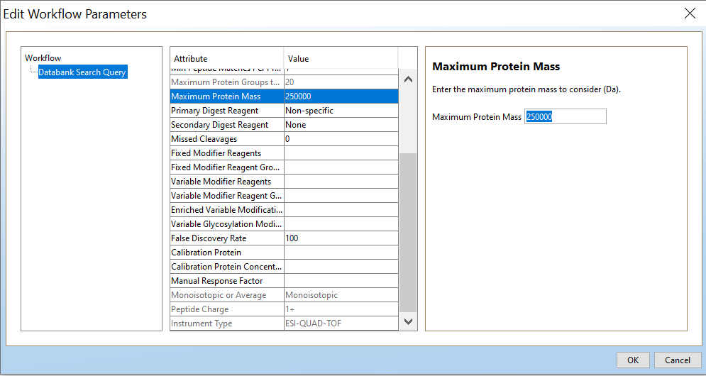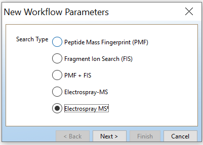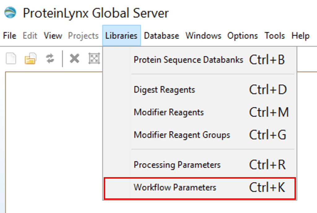 Open PLGS, Libraries, Workflow parameters, New…, Electrospray MSE, Select your FASTA file that you have uploaded in PLGS earlier (See section 4.3), Fill out the other parameters (if you are unsure, copy the ones you see in these screenshots) and lastly, give your parameters a name.