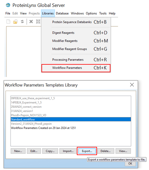 4.4. Select your .xml workflow processing parameters file, exported from ProteinLynx Global Server