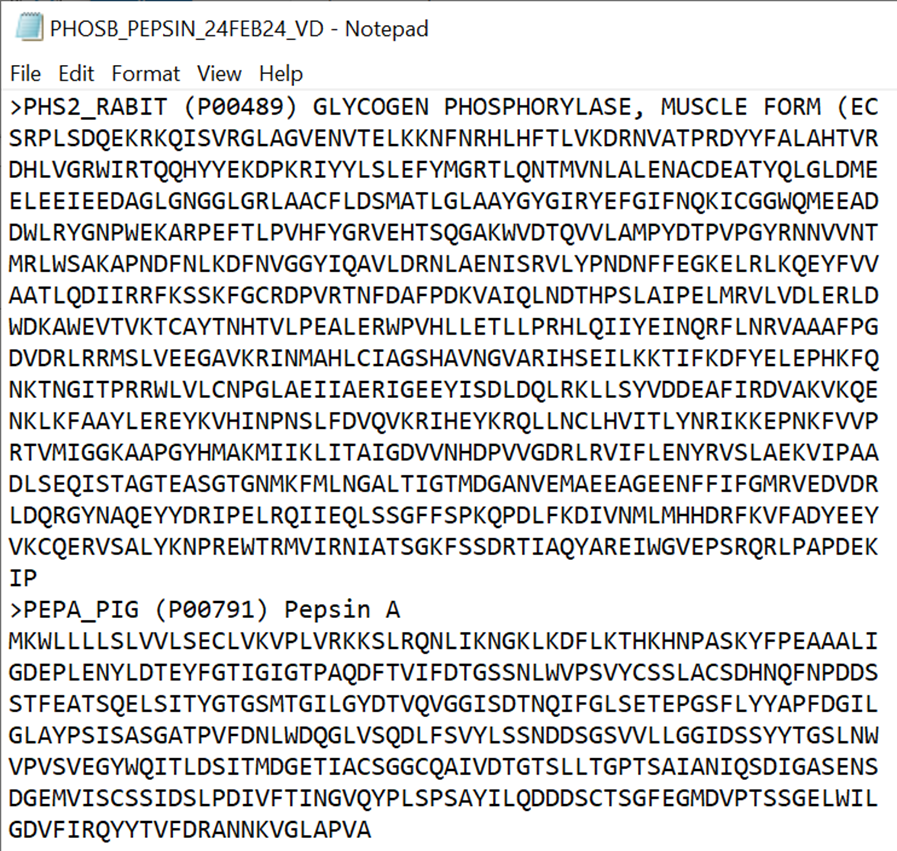 Add your protein sequence, and the sequences of any contaminants you expect to see (Here: PEPA_PIG, which is pepsin from the pepsin column digestion. PHS2_RABIT is our target protein)