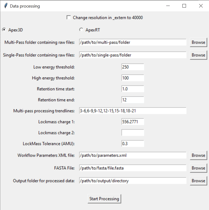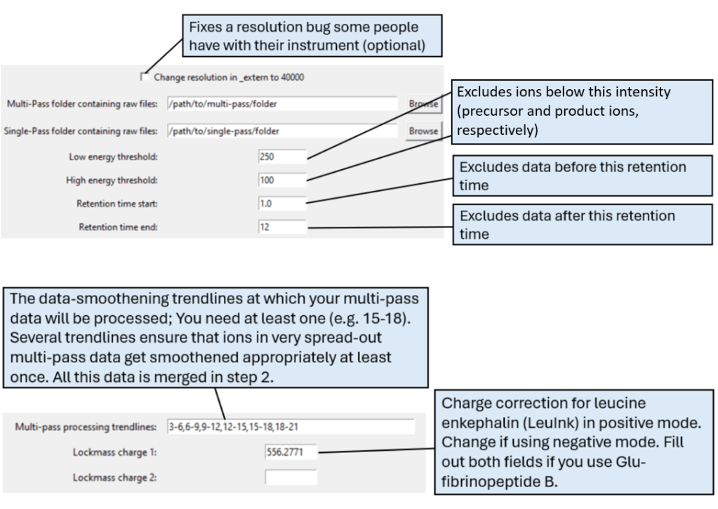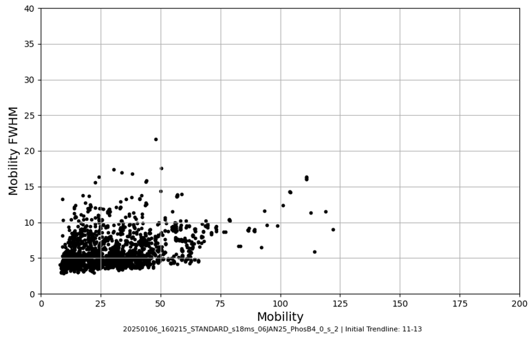 Access this tool through the main MultiPassMerger interface, and select a folder that contains the .raw files for which you want to plot a mobility vs. mobility FWHM graph with trendlines. Apex3D64.exe (PLGS) (or ApexRT.exe, if available to you) will ID the ions in the raw. files. Once finished, scroll down and select the resulting folder as the “Processed Data Folder” and select a output folder where you want your graphs to go. Now, the 2000 most intense ions will get plotted. You can generate graphs with or without trendlines, in random colours, user specific colours, or with colours for each trendline cluster. Choose to save trendlines in a notepad file if so desired.