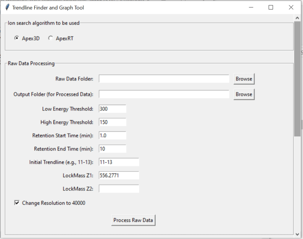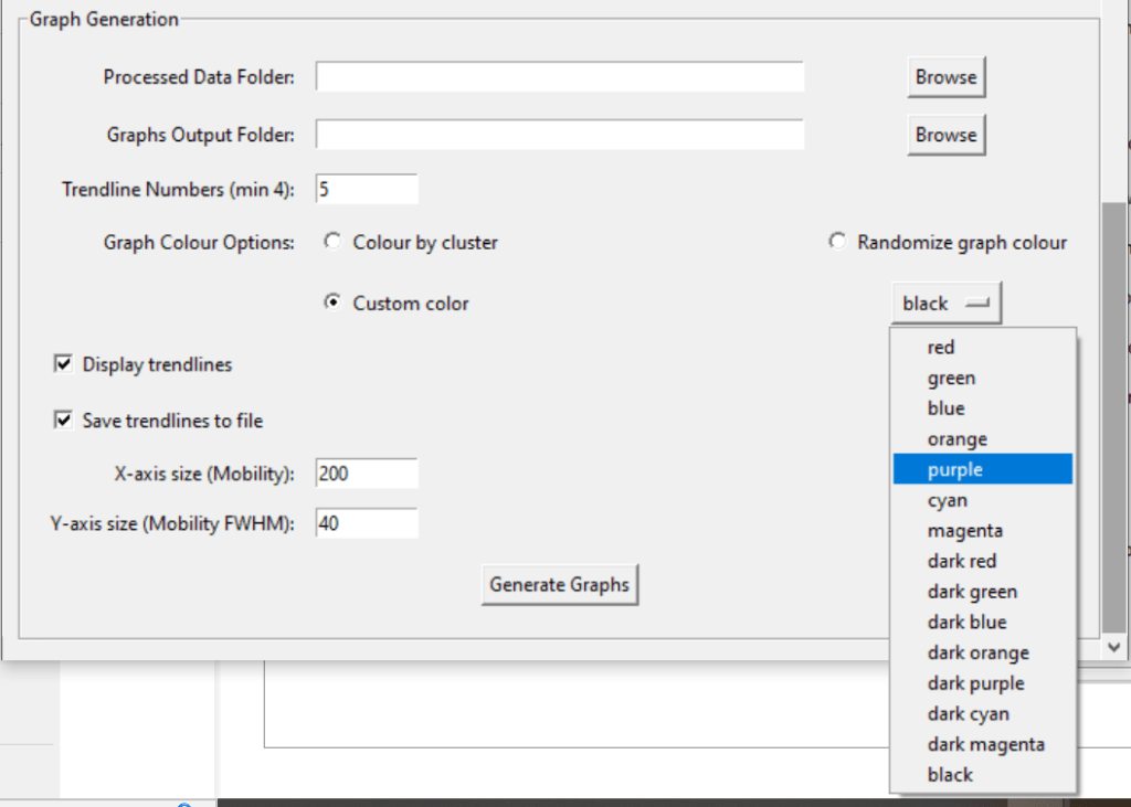 Once finished, scroll down and select the resulting folder as the “Processed Data Folder”. Make a output folder where you want your graphs to go. When you click generate graphs, the 2000 most intense ions will get plotted. You can generate graphs with or without trendlines, in random colours, user specific colours, or with colours for each trendline cluster. Choose to save trendlines in a notepad file if so desired.