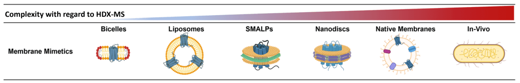 HDX-MS provides a unique opportunity to investigate the dynamics of transporters in various membrane mimetics. Given the critical role of the lipid bilayer in stabilizing membrane proteins and influencing their functionality, studying these proteins in a native-like environment is essential. Although MS-friendly detergents have historically been preferred due to their ease of use and minimal interference with MS spectra, they are unable to accurately replicate the native lipid bilayer. As a result, there is a growing trend in HDX-MS research towards utilizing more native membrane mimetics, such as nanodiscs, liposomes, and membrane vesicles, to provide a more accurate representation of the protein’s natural environment.
